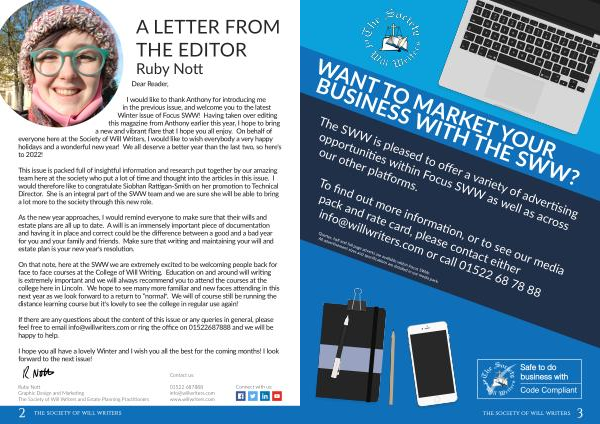 I would like to thank Anthony for introducing me in the previous issue , and welcome you to the latest Winter issue of Focus SWW ! Having taken over editing this magazine from Anthony earlier this year , I hope to bring a new and vibrant flare that I hope you all enjoy . On behalf of everyone here at the Society of Will Writers , I would like to wish everybody a very happy holidays and a wonderful new year ! We all deserve a better year than the last two , so here ’ s to 2022 !