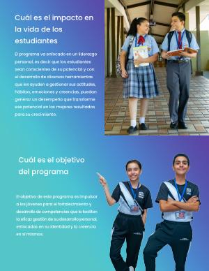 El programa va enfocado en un liderazgo personal , es decir que los estudiantes sean conscientes de su potencial y con el desarrollo de diversas herramientas que les ayuden a gestionar sus actitudes , hábitos , emociones y creencias , puedan generar un desempeño que transforme ese potencial en los mejores resultados para su crecimiento .