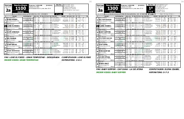 17 / 07 C602 437 1600 13 6 6 5 49A. Siso, 160,00 Kuro 32 Per3a 46 99.2 105.4 7 10 / 09 C774 425 1100 11 8 8 7 49F. Catarí, 200,00 Patt Coro 19 Per3a 71 65.2 CHExt 12 28 / 01 B2 1100 4 4 4 454F. J. Garcia, 12,00 Gracia Zuliana 13 Per4 + 73 71.1 73.4 6 12 / 03 B22 1200 9 1 1 1 54F. J. Garcia, 5,00 2 º Lady Luisa 9½ Per4 + 66 79.1 Ganó 7