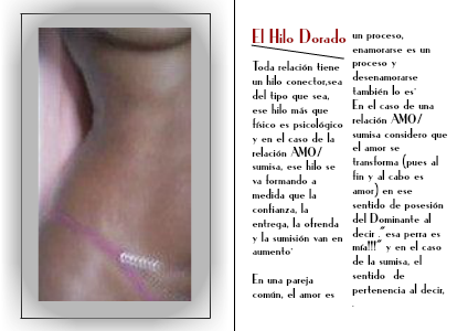 Toda relación tiene un hilo conector,sea del tipo que sea, ese hilo más que físico es psicológico y en el caso de la relación AMO/sumisa, ese hilo se va formando a medida que la confianza, la entrega, la ofrenda y la sumisión van en aumento·