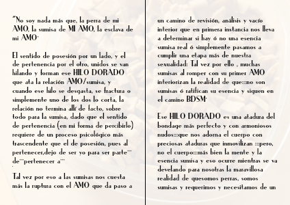 El sentido de posesión por un lado, y el de pertenencia por el otro, unidos se van hilando y forman ese HILO DORADO que ata la relación AMO/sumisa, y cuando ese hilo se desgasta, se fractura o simplemente uno de los dos lo corta, la relación no termina allí de facto, sobre todo para la sumisa, dado que el sentido de pertenencia (en mi forma de percibirlo) requiere de un proceso psicológico más trascendente que el de posesión, pues al
