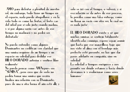 No puedo entender como algunos Dominantes no codifican con claridad que una sumisa requiere de un tiempo y un espacio en soledad para deshilar ese HILO DORADO anterior y sentirse libre realmente·
