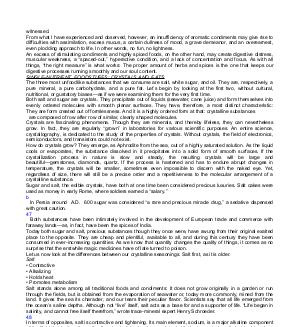 witnessed. From what I have experienced and observed, however, an insufficiency of aromatic condiments may give rise to difficulties with assimilation, excess mucus, a certain dullness of mood, a grave demeanor, and an overearnest, even plodding approach to life. In other words, no fun, no lightness. An excess of stimulating condiments and highly spiced foods, on the other hand, may create digestive distress, muscular weakness, a“ spaced-out,” hyperactive condition, and a lack of concentration and focus. As with all things,“ the right measure” is what works: The proper amount of herbs and spices is the one that keeps our digestive processes running smoothly and our soul content. SINGLE-NUTRIENT FOODSTUFFS: CRYSTALS AND FATS The three most unfoodlike substances that we consume are salt, white sugar, and oil. They are, respectively, a pure mineral, a pure carbohydrate, and a pure fat. Let’ s begin by looking at the first two, without cultural, nutritional, or gustatory biases— as if we were examining them for the very first time. Both salt and sugar are crystals. They precipitate out of liquids( seawater, cane juice) and form themselves into evenly ordered molecules with smooth planar surfaces. They have, therefore, a most distinct characteristic: They are form created out of formlessness. And it is a highly ordered form at that: crystalline substances are composed of row after row of similar, clearly shaped molecules. Crystals are fascinating phenomena. Though they are minerals, and thereby lifeless, they can nevertheless grow. In fact, they are regularly“ grown” in laboratories for various scientific purposes. An entire science, crystallography, is dedicated to the study of the properties of crystals. Without crystals, the field of electronics, semiconductors, and transistors could not exist. How do crystals grow? They emerge, as Aphrodite from the sea, out of a highly saturated solution. As the liquid cools or evaporates, the substance dissolved in it precipitates into a solid form of smooth surfaces. If the crystallization process in nature is slow and steady, the resulting crystals will be large and beautiful— gemstones, diamonds, quartz. If the process is hastened and has to endure abrupt changes in temperature, the crystals will be smaller, sometimes even impossible to discern with the naked eye. Yet, regardless of size, there will still be a precise order and a repetitiveness to the molecular arrangement of a crystalline substance. Sugar and salt, the edible crystals, have both at one time been considered precious luxuries. Salt cakes were used as money in early Rome, where soldiers earned a“ salary.” b In Persia around A. D. 600 sugar was considered“ a rare and precious miracle drug,” a sedative dispensed with great caution. 47