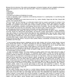 • Promotes both buildup and breakdown to excess In terms of opposites, sugar is expansive and loosening; because it is a carbohydrate, it is acid-forming( the carbohydrate metabolizes into water and carbonic acid, which then turns into Co 2, carbon dioxide). Sugar and salt, then, though both crystals, have opposite effects. The word sugar has two meanings, an unfortunate situation that has caused a great deal of confusion in the lay public. One meaning is the popular one: Sugar is the sweet white or brown stuff spooned into coffee, sprinkled over grapefruit, used by the cupful to make cookies and cakes. The other meaning is chemical: Sugars are sweet-tasting, crystalline carbohydrates that are part of foodstuffs. They are often named according to the foodstuff with which they are associated. These are lactose( milk), maltose( malt, grain), fructose( fruit), as well as glucose( the form of sugar found in the blood), sucrose( refined sugar), and others. The carbohydrates( both sugars and starches) are found in natural foods such as grains, beans, vegetables, and fruits. Sugars are called simple carbohydrates, and starches complex carbohydrates. In natural foods they come with a team of co-worker nutrients that help the body metabolize them; they are then called natural carbohydrates. White sugar, white rice, and white flour— separated from the minerals, vitamins, protein, and fiber that originally assisted them— are known as refined carbohydrates. Crystalline table sugar, a simple refined carbohydrate, is obtained by first extracting the juice from sugar cane, leaving the bulk and fiber behind. The juice is then purified, filtered, concentrated, and boiled down until sugar crystallizes out of the syrup. c