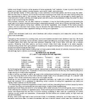 edible, even though it may be at the expense of some apparently“ lost” nutrients. A case in point is that of bitter greens such as kale, collards, mustard greens, even carrot, radish, and turnip tops. Up until perhaps twenty or thirty years ago, it was customary to boil leafy greens and throw away the water. With the discovery of vitamins, and of the fact that these substances are drawn into the water during boiling and thus discarded along with it, this practice came under attack. Today we are encouraged to steam greens in small amounts of water until they are bright green and still crunchy, and preferably to keep the water for other uses so as to avoid losing the nutrients. Folk practices, however, are not often irrational or mistaken. It may be that boiling greens and discarding the water gets rid of certain medicinal and perhaps undesirable elements, which have a strong and bitter taste. The fact that mustard greens, turnip tops, collards, and similar vegetables, once staples of the hearty peasant cuisine, are not consumed much today, may be because the light steaming now recommended as the ideal cooking method leaves these vegetables tasting too strong and unpleasant. 4 Cooking greens also eliminates oxalic acid, which interferes with calcium absorption, and makes the calcium in these foods more assimilable. 5 I brought up this comment in a cooking class, and some students decided to test whether it was true. We found that boiling kale, uncovered, for ten minutes, made it sweet and delicious; curiously enough, the color remained a brighter green than when the kale was steamed. Steaming it left it hard, bitter, and dull— not a culinary success. Steaming most bitter greens, we found, doesn’ t make them tasty enough to be eaten regularly, whereas boiling makes them quite pleasant. Sautéeing the chopped boiled greens in some olive oil with garlic or mushrooms further enhances their flavor. Contrary to what we might expect, boiling does not leave greens totally devoid of nutrients, because they are so astonishingly high in vitamins and minerals to begin with.