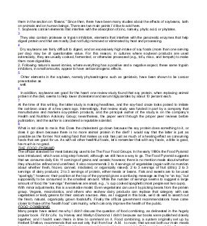 them in the section on“ Beans.” Since then, there have been many studies about the effects of soybeans, both on animals and on human beings. There are two main points I’ d like to add here. 1. Soybeans contain elements that interfere with the absorption of zinc, namely, phytic acid, or phytates. 3 They also contain protease or trypsin inhibitors, elements that interfere with the pancreatic enzymes that help digest protein and that are mostly( but not fully) removed or eliminated by heat and processing. 4 Dry soybeans are fairly difficult to digest, and an excessively high intake of soy foods( more than one serving per day) may be of questionable value. For this reason, in cultures where soybean products are used extensively, they are usually cooked, fermented, or otherwise processed( e. g., tofu, miso, and tempeh) to make them more digestible. 2. Following nature’ s sweet ironies, where everything has a positive and a negative aspect, these same trypsin inhibitors, in small amounts, appear to have anticarcinogenic effects. 5 Other elements in the soybean, namely phytoestrogens such as genistein, have been shown to be cancer preventative as well. 6 In addition, soybeans are good for the heart: one review study found that soy protein, when replacing animal protein in the diet, seems to help lower cholesterol and serum triglycerides by about 10 percent each. 7 At the time of this writing, the latter study is making headlines, and the soy-food craze looks poised to imitate the oat-bran craze of a few years ago. Interestingly, that review study was funded in part by a company that manufactures and markets soy-protein products, and the principal author of the study is on the company’ s Health and Nutrition Advisory Group; nevertheless, the paper went through the proper peer reviews before publication, and the author is considered a reputable scientist. 8 What is not clear to me is this: Does the cholesterol go down because the soy protein does something to it, or does it go down because there is no more animal protein in the diet? I would say that the latter is just as possible as the former. Not eating food that makes us sick has just as much of a healing effect as consuming foods that are good for us. As with all other healthful foods, let’ s remember that with soy foods, a little is good, too much is no good. THE FOOD PYRAMID The official standard for meal balancing used to be The Four Food Groups. In the early 1990s the Food Pyramid was introduced, which was a big step forward, although we still have a way to go. The Food Pyramid suggests that we consume daily 6 to 11 servings of grains and cereals; however, there is no mention made about whether they should be refined and unrefined. It also recommends 3 to 4 servings of vegetables( again with no mention about whether fresh, frozen, canned, irradiated, or organically raised); 2 to 3 servings of fruit( ditto); 2 to 3 servings of dairy products; 2 to 3 servings of protein, either meats or beans. Fats and sweets are to be used“ sparingly”; however, their position at the top of the pyramid gives a confusing message as they’ re“ on top,” but supposedly to be consumed in the smallest amount. While the number of servings seems to suggest a large amount of food, the“ servings” themselves are small, e. g., ½ cup cooked spaghetti( most people eat two cups). With minor adjustments, this is a workable model. Even vegetarians can use it by picking beans from the protein group. Vegans, macrobiotics, and others who eschew dairy products can replace that category with sea vegetables or leafy greens for their calcium sources. Also, as I suggest in this book, we’ d do well to search out the fresh, natural, organically grown foodstuffs. Finally the official government recommendations have come closer to those of the“ health food” community, which can only improve the health of the public. FOOD COMBINING Many people have asked me why I didn’ t discuss the question of food combining, as delineated in the hugely popular book Fit for Life, by Harvey and Marilyn Diamond. I didn’ t because our books were published closely together, and I hadn’ t seen theirs in time to comment on it. Food combining, a system originally set up by Herbert Shelton, recommends that we eat only fruit from four A. M. to noon; that we eat both our main meals between noon and eight P. M.; and that we eat nothing at all between eight P. M. and four A. M. Our main meals should consist only of either protein and vegetables or grains and beans and vegetables; starches( potatoes, bread, rice, whole grains) and animal protein( fish, fowl, meat, eggs) should not be eaten together; fruit should be eaten by itself, never with vegetables; and melons should always be eaten alone. Students of mine who have tried this system have told me that fruit for breakfast works best in the summer or in warm climates, and for people who are physically active. On the other hand, for office workers and in cold climates this regime often makes them chilled, hungry, and tired. These reactions can be understood with the expansive / contractive, heating / cooling concepts discussed in chapter three. The meal combinations( protein and vegetables, no starch; or starch and vegetables, no protein) are difficult for widespread use in the average