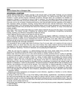 WITHDRAWAL SYMPTOMS It goes without saying that a positive change in diet should make us feel better. Perhaps not one hundred percent, but there should be a discernible change toward healing. The healing process itself often becomes manifest in certain general physical withdrawal symptoms. Because these can sometimes be mistaken for symptoms of illness, it is important to know of them in advance. The information that follows is based on the systems model of the body we’ ve been working with, on my experiences and observations over the past twentyfive years, and on the concepts of healing advanced by most natural-health theorists regardless of the details of their respective dietary proposals, including, among others Michio Kushi, Samuel Hahnemann, Paavo Airola, and Herbert Shelton.( It is unfortunate that the irritating rhetoric and ill-chosen expressions of several authors of natural-healing theories have prevented their ideas from reaching a wider audience, for many of the ideas are indeed valuable.) Let’ s keep in mind our model of the body as a system where, between the input and the output, a lot of activity takes place. This activity consists of building up, breaking down, transforming, transporting, synthesizing, holding, expelling, and otherwise manipulating matter and energy. It often happens that the output cannot keep up with the input: