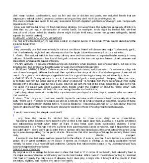 diet; many habitual combinations, such as fish and rice or chicken and pasta, are excluded. Meals that are vegan( zero animal protein) create no problem as long as they don’ t mix fruits and vegetables. The meal combinations seem to be very successful for both digestion problems and weight loss. People with digestive disorders have less distress following the food-combining strategy. For weight loss, the system is especially effective in diets that include regular consumption of animal foods; for example, lunch might be broiled fish, stir-fried broccoli and onions, salad( no starch); dinner might include lentil soup, brown rice, greens with garlic, baked squash( no animal protein). FURTHER NOTES ON FOOD REMEDIES I’ ve had terrific feedback on the remedies section in chapter twelve of this book. When people understand the systems theory from part 1, they can easily pick their own remedy for various conditions. Here I will discuss one major food remedy, garlic, that I inadvertently neglected, and also expound on the Apple Juice – Kuzu remedy I discuss in the text. 1. Garlic. This natural antibiotic has many culinary uses and has also been a respected herbal remedy in many cultures. Scientific research has found that garlic enhances the immune system, lowers blood pressure and cholesterol, and protects against infection.