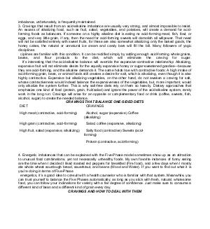 imbalance, unfortunately, is frequently maintained. 3. Cravings that result from an acid-alkaline imbalance are usually very strong, and almost impossible to resist. An excess of alkalizing food, such as fruit, salad, vegetables, and potatoes, will create a demand for acidforming foods as balancers. If someone on a highly alkaline diet is eating no acid-forming meat, fish, fowl, or eggs, and very little grain, if any, then the need for acid-forming sweets will demolish all willpower. That need will not be satisfied entirely with sweet fruits, for these are also somewhat alkalizing; only the baked goods, the honey cakes, the natural or unnatural ice cream and candy bars will fill the bill. Many followers of yogic disciplines ciplines are familiar with this condition. It can be rectified simply by adding enough acid-forming whole grains, beans, and flour products to the diet, which will eliminate the craving for sugar.