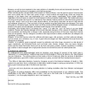 illnesses, we will be more resistant to the outer pollution of unhealthy foods and environmental chemicals. This vision hit me with the force of a revelation, and it left me stunned. While I did discuss this concept briefly in the section on“ Serious Illness,” over the past ten years I have become even more certain that my vision was correct. Drugs— I mean medical and legal drugs, which are simply the opposite of the illegal ones— are proliferating at a rate that seems unstoppable. Every health problem, regardless of its true cause, is reason for more research to find yet another magic bullet. The media touts every new drug as the great new hope for our deliverance from disease. Nobody seems to notice that every great new drug hope always turns out to have nasty adverse effects, so that twenty years later we have to deal with the new diseases caused by it. Then we have to find yet another drug that heals those new diseases. The more time goes on, the worse it gets, and the more I am firmly convinced that iatrogenic( doctor- or treatment-caused) disease is the great unacknowledged, worldwide health tragedy of the twentieth century. Fortunately, even though food is not always the cause, it is often the cure for many of our new health problems. People who develop allergies and immune disorders because of the overuse of antibiotics, drugs, and vaccinations are finding that a change in diet, especially along the lines of this book, helps them bounce back and recuperate. The two iatrogenic conditions that respond best to dietary modification are allergies and candidiasis, or candida. Allergies of any kind improve when the sufferers eliminate sugar, milk products, and their particular allergen, such as wheat, corn, tomatoes, soy, or nuts. A good clinical ecologist can help determine the exact foods and substances to eliminate. Candida, or a systemic yeast overgrowth caused by antibiotics and other drugs, responds to a diet devoid of sugar, sweeteners, and fermented foods, such as bread, wine, cheese, vinegar, miso, soy sauce, tempeh, molds( and the foods that harbor them such as dry fruits and juices), pickles, mustard, sauerkraut. In addition, this condition is best managed with a high-protein( beans and animal food) and low-carbohydrate diet. 10 ALTERNATIVE MEDICINE An underground and unacknowledged world for decades, even though 70 percent of the world uses it,“ alternative” or“ complementary” medicine was thrust into the limelight in 1993 by an article in the New England Journal of Medicine. The article pointed out that nearly a third of Americans utilize the services of alternativehealth practitioners, spend $ 10.3 billion out-of-pocket on it yearly, and don’ t tell their medical doctors about it. 11 The Office of Alternative Medicine, funded by Congress as part of the National Institutes of Health in 1992, opened one year later. Soon, conferences on alternative medicine began to spring up everywhere. In 1994, two serious peer-reviewed journals in the field were launched, 12 and more and more physicians are paying attention to healing modalities other than Western technological medicine. The growth of nondrug therapies offers real possibilities for the improvement of our collective health. This amplification of the field of healing was a vision I laid out in this book( see“ A Proposal for Unifying the Opposites”). I am thoroughly delighted to see it now happening.