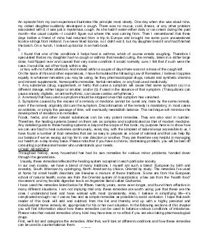 I found that one of the conditions it helps heal is asthma, which of course entails coughing. Therefore I speculated that as my daughter had no cough or asthma that needed curing, the remedy, taken in a rather large dose, had flipped over and caused that very same condition it would normally cure. I felt that if such were the case, it would be out of her body within a day or two, with no further attention. And indeed within a couple of days there was not a trace of the cough left. On the basis of this and other experiences, I have formulated the following Law of Remedies. I believe it applies equally to whatever remedies you may be using, be they pharmacological drugs, natural and synthetic vitamins and mineral supplements, homeopathic remedies, herbal remedies, or any food used medicinally: 1. Any substance( drug, supplement, or herb) that cures a symptom will cause that same symptom( a) in a different dosage, either larger or smaller; and / or( b) if used in the absence of that symptom.( Tranquilizers can cause anxiety; digitalis, an anti-arrhythmic, can cause cardiac arrhythmias.) 2. A remedy that has cured a symptom should be stopped once that symptom has vanished. 3. Symptoms caused by the excess of a remedy or medicine cannot be cured any more by the same remedy, even if the remedy originally did cure the symptom. Discontinuation of the remedy is mandatory; in most cases an antidote, or simply the passage of time, will eventually reestablish balance. This technique will minimize the development of resistance to remedies. Foods, herbs, and other natural substances can be very potent remedies. They are also vast in number. Therefore, the healing systems based on them are as complex and sophisticated as that of modern medicine. Any detailed guide to these healing systems is beyond the scope of this book; my purpose here is to show how we can use food to heal ourselves continuously, every day, with the simplest of natural ways accessible to us. I have found a number of food remedies that are as easy to prepare as a bowl of oatmeal and that can help flip our balance if we’ ve swung out too far in one direction or another. They are therefore very helpful in managing our health on a day-to-day basis. Please note that if you have a chronic, distressing problem, you will be best off consulting a professional healer who understands your needs. HOME REMEDIES Throughout history, every household has had its own remedies for various minor problems, handed down through the generations. Usually, these remedies reflected the healing system accepted in each particular society. In our own society, we have a blend of many traditions. I myself am such a blend: European by birth and ancestry, South American by upbringing, North American by choice, Oriental by study. The remedies I’ ve used at home for small health disorders are likewise a mixture of these traditions. Some are from the European school of natural health; some are from the Oriental system of macrobiotics; a few are from the“ health food” movement; and my favorite digestive tea is an Argentine blend called Cachamai. I have used the remedies listed below for fifteen, twenty years, some even longer, and found them effective in many different situations. I am not implying that only these remedies are worth using; just that these are the ones I understand best and have worked with most consistently. Also, I believe in simplifying life— it’ s complicated enough— so I use as few and as simple remedies as possible to avoid confusion. I hope that each reader of this book will add and subtract from the list and thereby end up with a highly personal and individualized home remedy kit, appropriate for his or her own situation. In the following sections of this chapter you will find information about how these remedies can be used to balance various conditions of imbalance. Please note that natural remedies of any kind may have less or no effect if you are also taking pharmacological drugs. First, we’ ll list and categorize the remedies. After that, we’ ll look at different conditions and how these remedies can be used to counterbalance them.