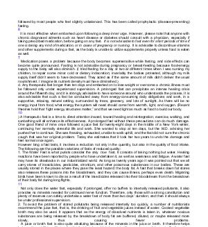 followed by most people who feel slightly unbalanced. This has been called prophylactic( disease-preventing) fasting. 8 It is most effective when embarked upon following a deep inner urge. However, please note that anyone with chronic diagnosed ailments such as heart disease or diabetes should consult with a physician, especially if taking prescribed medication, before going on any fast. It is not advisable to fast even for short periods of time if one is taking any kind of medication, or in cases of pregnancy or nursing. It is advisable to discontinue vitamins and other supplements during a fast, as the body is unable to utilize supplements properly unless food is eaten as well. † Medication poses a problem because the body becomes supersensitive while fasting, and side effects can become quite pronounced. Fasting is not advisable during pregnancy or breast-feeding because food-energy supply to the baby will also diminish.( I tried fasting for a day or two at different times when I was nursing my children, to repair some minor cold or dietary indiscretion; invariably the babies protested, although my milk supply itself didn’ t seem to have decreased. They acted as if the same amount of milk didn’ t deliver the usual nourishment. I imagine its nutrient density must have diminished.) d. Any therapeutic fast longer than ten days and embarked on to lose weight or overcome a chronic illness must be followed only under experienced supervision. A prolonged fast can precipitate an intense healing crisis around the fifteenth day, and it is strongly advisable to have someone around who understands the process. It is also advisable that such a fast be conducted away from energy-consuming daily obligations and work, in a supportive, relaxing, natural setting, surrounded by trees, greenery, and lots of sunlight. As there will be no energy input from food, what energy the system will need should come from warmth, light, and oxygen.( Recent theories hold that“ light energy structures matter,” and that we need light as much as food to build our body. 10) A therapeutic fast is a time to direct attention inward, toward healing and reintegration; exercise, walking, and sunbathing will all enhance its effectiveness. A prolonged fast without these precautions can do much damage. One good friend of mine once followed a juice fast for twenty-eight days in the middle of a New York winter, continuing her normally stressful life and work. She wanted to stop at ten days, but the M. D. advising her pushed her to continue. She was freezing, exhausted, unable to walk uphill, and the fast did not cure the chronic cough that was her original problem. Today she estimates that it took her two years to undo the damage and feel normal once again. However long a fast lasts, it involves a reduction not only in the quantity, but also in the quality of food intake. The following are the possible variations of fasts of reduced quality: 1. The Water Fast is what purists consider the only true fast. It consists of taking nothing but water. Healing reactions have been reported by people who have undertaken it, as well as weakness and fatigue. A water fast may have its drawbacks in our industrialized world. As long as twenty years ago it was pointed out that we all carry stores of insecticides, pesticides, strontium, and other poisonous substances in our bodies. These are usually stored in the places where they pose the least hazard: the body fat. A fast that breaks down fat stores also releases these poisons into the bloodstream, and they can cause illness, perhaps even death. Migrating birds have been known to die as a result of the insecticides released into their bloodstream from the breakdown of their body fat during long flights. 11 Not only does the water fast, especially if prolonged, offer no buffers to internally released pollutants, it also provides no minerals needed for continued nerve function. Therefore, only those with a strong constitution and plenty of reserves can safely undertake a water fast of more than two days’ duration; and then it should always be under professional supervision. 2. To avoid the problem of stored pollutants being released internally too quickly, a number of nutritionists recommend the juice fast, that is, the drinking of fruit and vegetable juices instead of water. Cooked vegetable broth may also be used. It appears that as the energy of dissolved nutrients is taken in, whatever noxious substances are being released by the breakdown of body fat are buffered, diluted, or maybe released more slowly, thus causing fewer problems.