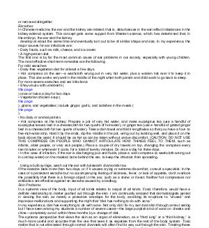 • Hot compress on the kidney: Prepare a pot of very hot water, and make eucalyptus tea( use a handful of eucalyptus leaves tied in a cheesecloth for two quarts of hot water), or ginger tea( use a handful of grated ginger tied in a cheesecloth for two quarts of water). Take a dish towel and fold it lengthwise so that you have a four- to five-inch-wide strip. Hold it by the ends, dip the middle in the pot, wring out by twisting well, and place it on the back above the waist. It should be as hot as can be taken without undue discomfort.( CAUTION: DO NOT USE THIS COMPRESS ON PEOPLE WHO CANNOT ARTICULATE HOW THINGS FEEL TO THEM, such as infants, older people, or very sick people.) Place a couple of dry towels on top, changing the compress every two minutes or whenever it cools, for a total of twenty minutes. Do once a day for three days.