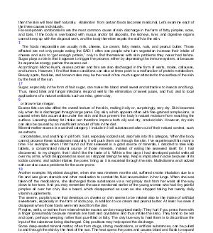 The foods responsible are usually milk, cheese, ice cream, fatty meats, nuts, and peanut butter. Those affected are not only people eating the SAD: I often see people who turn vegetarian increase their intake of cheese and nuts to“ get enough protein,” only to find themselves with skin problems they never had before. Sugar plays a role in that it appears to trigger the process, either by depressing the immune system, or because its expansive energy pushes the excess out. According to Michio Kushi, excess protein and fats are also discharged in the form of warts, moles, callouses, and tumors. However, I find that these conditions can also at times point to a malfunction of protein metabolism. Beauty spots, freckles, and brown moles may be the result of too much sugar attracted to the surface of the skin by the heat of the sun. 17 Sugar, especially in the form of fruit sugar, can make the blood smell sweet and attractive to insects and fungi. Thus, insect bites and fungal infections respond well to the elimination of sweet juices, and fruit, and to local applications of a natural antibiotic such as miso, green clay, § or brown-rice vinegar. Excess fats can also affect the overall texture of the skin, making it oily or, surprisingly, very dry. Skin becomes oily when fat is discharged through large pores. Dry skin, which appears often with fine-grained complexions, is caused when fats accumulate under the skin and thus prevent the body’ s natural moisture from reaching the surface. Lowering dietary fat intake can therefore improve both oily and dry, cracked skin. However, dry skin can also be caused by an insufficient amount of fats in the diet. Mineral-matter excess is a catchall category. I include in it all substances taken out of their natural context, such as extracts, concentrates, and anything in pill form. Salt, especialy iodized salt, also falls into this category. When the body cannot process these substances naturally, it will push them out through the skin. I’ ve experienced this many a time. For example, when I first found out that seaweed is a good source of minerals, I decided to take kelp tablets, a concentrated natural source of those minerals, instead of eating the seaweed itself, for I had discovered, to my chagrin, that I didn’ t like the taste of it. Within a few days I had developed painful welts all over my arms, which disappeared as soon as I stopped taking the kelp. Kelp is implicated in acne because of its iodide content, and iodide irritates the pores’ lining as it is excreted through the skin. Multivitamins and iodized salt can also cause problems for the acne-prone. 18 Another example: My eldest daughter, when she was nineteen months old, suffered smoke inhalation due to a fire and was given steroids and other medication to combat the fluid accumulation in her lungs. When she was taken off the medications, she discharged those substances via a red pimply rash from her waist all the way down to her toes. And you may remember the case mentioned earlier of the young woman who had tiny painful pimples all over her chin, like a beard, which disappeared as soon as she stopped taking her twenty daily vitamin supplements. The severe, purplish acne that develops on cheeks or chin seems to be related also to the intake of artificial sweeteners, especially in the form of soda pop, in addition to ice cream and peanut butter. At least I’ ve seen it disappear when those foods were removed from the diet. Pimples, welts, or rashes from mineral-matter excess can be recognized easily: They hurt if you press them with a finger( presumably because minerals are hard and crystalline and thus irritate the skin). They tend to be red and open, perhaps weeping, rather than pus-filled or fatty. The only true way to heal them is to discontinue the input of the substance being discharged. Clay poultices may help speed the discharge. Some deep-seated mineral matter, often from drugs, strong medications, or artificial substances, can be pulled to and through the skin by the heat of the sun. The heat opens the pores and causes blood and fluids to expand and rise to the surface; this, in turn, can bring useless or toxic substances with it, attempting to expel the latter from the body. In some cases this could give rise to irritations or diseases, including skin cancer, which appears to be“ caused” by the sun. But not all committed sunbathers get cancer, nor do all skin cancer sufferers lie regularly in the sun. Therefore, perhaps we should consider the possibility that the sun only causes skin diseases if the body gives it something to work with. Organ malfunctions, or general metabolic imbalances, can manifest themselves in the form of chronic skin conditions, such as psoriasis, eczema, and other scaly, itchy, or weepy conditions. Allergic reactions and nutritional-deficiency symptoms also belong in this category. A switch to a simple, natural diet of whole grains, beans, and cooked vegetables, avoiding meats, milk products, refined sugar and grains, an excess of fruit, nut