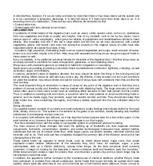 • Grated apple with skin, allowed to turn brown. INFLAMMATION In problems of inflammation of the digestive tract, such as ulcers, colitis, spastic colon, and so on, abstinence from raw vegetables and fruits is usually very helpful. One of my students, sent to me by her doctor, had a serious case of reflux esophagitis, which gave her attacks of palpitations and breathlessness similar to heart attacks. She invariably had one if she ate a large salad, but did fine, as we soon discovered, with cooked vegetables, grains, and beans— she even lost twenty-five pounds on this regime! Cases of colitis have also responded well to all-cooked-food diets, if they included a high proportion of alkalizing foods such as cooked vegetables and soups; small amounts of beans, brown rice, and millet; maybe a bit of fish. Miso soup with seaweed and shoyu-kuzu are good support foods in these cases as well. Kuzu, incidentally, is my preferred universal remedy for disorders of the digestive tract. I find that shoyu-kuzu on an empty stomach is excellent for cases of expansion, gassiness, or even bleeding ulcers. Shoyu-kuzu with umeboshi( good as an antacid) is helpful for indigestion or overeating. Apple-juice kuzu pudding( a relaxing concoction) helps counterbalance contraction, tightness, cramping, as well as tension, anger, and irritability. In serious, persistent cases of digestive disorder, the kuzu should be taken first thing in the morning and just before retiring. Milder cases do well with kuzu once a day. My children, if they’ ve eaten out too much and feel a bit under the weather, may refuse dinner and ask for a bowl of shoyu-kuzu with umeboshi; then they are fine the next morning. The most important thing to remember in cases of ulcers at any point of the digestive tract is that they are a problem of excess acidity and therefore must be treated with alkalizing foods. The large amounts of milk and cream often used to treat ulcers would have an acidifying effect because of their high protein and fat content. Thus, in addition to avoiding milk and cream, it would be wise for ulcer patients to avoid acid-forming foods in general, such as meats, eggs, flour products, sugar and sweets, alcohol, and fats. They should also keep their grain intake low, chew everything thoroughly, and follow a dietary approach like the one indicated above for colitis. Eating Disorders Our appetite system consists of our taste and smell sensations, bodily feelings that indicate desire for food and drink, satiety, and so on. This system is the sentinel at the gates of our stomach, ideally allowing only healthful substances in and keeping noxious ones out. It is a system both effective and efficient, as it has kept the human species alive for a few million years. In the past hundred or so, however, there have been some changes in our food supply that have wreaked havoc with the ability of our appetite system to understand what we’ re eating. The most obvious of these changes has been the splitting up of foodstuffs into their separate chemical components. Extraction, concentration, isolation, and similar technological maneuvers have yielded nutritive substances that are out of context: white flour, white sugar, juices, soy-protein isolates, individual vitamins and minerals, and so on. Their wide use has completely changed the common diet of the Western world and is fast changing that of the rest. These partial foods— as opposed to whole foods, such as whole wheat bread, sugar cane, fruit, whole soybeans— create relative deficiencies of the elements they don’ t have; for example, sugar, a pure carbohydrate, sets up a vitamin deficiency, among other things. As the body perceives itself unevenly nourished, it keeps on looking for the elements it needs to balance itself and therefore“ gets the munchies.” White bread and jam create a need for protein, fiber, and minerals; a potato chip and ice cream binge may be the attempt to meet that need. In addition, the appetite is further confused by the increased use of chemical additives, whether they’ re made from petroleum or isolated from natural substances. Some foods that would normally be spoiled don’ t taste spoiled, others taste like what they’ re not, and some that are in fact harmful seem delicious. How’ s a body to know what to eat? An increasingly common condition with varying degrees of severity, eating disorders indicate, above all, a breakdown of the appetite system’ s ability to monitor food intake. Hunger, in a body fed isolated foodstuffs, becomes unreliable or even disappears. One specific episode illustrated this phenomenon for me most dramatically. Some months ago, my friend Judy was complaining about her insatiable hunger.“ No matter what I eat,” she said,“ I’ m hungry after every meal. I feel unsatisfied, and go munching on chips or crackers or whatever. And I know I don’ t need it! I just can’ t help myself. Do you have any thoughts on this?” I did indeed, for I’ d seen many of my students go through the same experience and had found my solution to be amazingly effective: Look for
