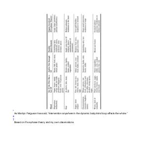 * As Marilyn Ferguson has said,“ Intervention anywhere in the dynamic body / mind loop affects the whole.” 4 † Based on Five-phase theory and my own observations.