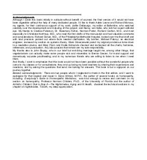 Acknowledgments Although I wrote this book initially in solitude without benefit of counsel, the final version of it would not have been digestible without the help of many dedicated people. I’ d like to thank Adele Leone and Richard Monaco, my agents, for their continuous support of my work; Joëlle Delbourgo, my editor at Ballantine, who watched carefully over the development and maturing of this project; and Nancy van Itallie, who lent her expert editorial eye. My thanks to Clarèse Peterson, Dr. Rosemary Felton, Norman Porter, Richard Carlton, M. D., and most especially to Christiane Northrup, M. D., who read the first drafts of the manuscript and had valuable comments and considerations. Richard Donze, M. D., of the Philadelphia Methodist Hospital, looked over the final draft and with kind precision pointed out where facts needed clarification. My brother, Michael Polonyi, an electrical engineer, reviewed my section on systems theory. Klara Glowczewski pared my original ponderous tome down to a readable volume, and Mary Flynn and Dodie Edmands checked and rechecked all the charts, footnotes, references, and punctuation. Any inaccuracies that remain are my sole responsibility. My thanks also to John Boyajy, who in our brief but enriching marriage taught me, among other things, that vegetarianism can actually make some people sick and miserable; to Bernie Gavzer, for moral support and marvelously accurate proofreading; and to my numerous friends who are willing to listen to me when I need them. And finally, I want to emphasize that this book would not have been possible without the wonderful people who come to my classes or for consultations; they end up being my best teachers by sharing their experiences and reactions, and by asking the questions that send me looking for answers. This book is but a signpost on our journey together. Belated acknowledgments: There are two people whom I neglected to thank in the first edition, and I want to apologize for that neglect and repair it. Dana Ullman, M. P. H., the author of several books on homeopathy, including Everybody’ s Guide to Homeopathic Medicines, was kind enough to review and comment on my section on homeopathy. Professor Norman Childers, Ph. D., of the University of Florida and the author of Arthritis: Childers’ Diet to Stop It— The Nightshades, Aging and Ill Health, checked the technical sections in my chapter on nightshades. To both, my deep appreciation.