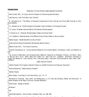 B. Lonnerdal et al.,“ The Effect of Individual Components of Soy Formula and Cow’ s Milk Formula on Zinc Bioavailability.” 4. D. L. Brandon et al.,“ ELISA Analysis of Soybean Trypsin Inhibitors in Processed Foods.” 5. I. E. Liener,“ Possible Adverse Effects of Soybean Anticarcinogens.” 6. C. Herman et al.,“ Soybean Phytoestrogen Intake and Cancer Risk.” 7. J. W. Anderson,“ Meta-Analysis of the Effects of Soy Protein Intake on Serum Lipids.” 8. Natalie Angier,“ Health Benefits from Soy Protein.” 9.“ Kudzu Extract Shows Potential for Moderating Alcohol Abuse.” 10. William Crook, M. D., The Yeast Connection. 11. David M. Eisenberg et al.,“ Unconventional Medicine in the United States— Prevalence, Costs, and Patterns of Use.” 12. The Journal of Alternative and Complementary Medicine: Research on Paradigm, Practice, and Policy; Marc S. Micozzi, M. D., Ph. D., editor; Mary Ann Liebert, Inc., New York, N. Y., publisher. Alternative Therapies in Health and Medicine; Larry Dossey, M. D., executive editor; InnoVision Communications, Aliso Viejo, Calif., publisher.