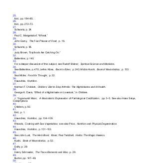 25. Ibid., pp. 184 – 85. 26. Ibid., pp. 272 – 73. 27. Schwartz, p. 24. 28. Paul C. Mangelsdorf,“ Wheat.” 29. John Garvy, The Five Phases of Food, p. 16. 30. Schwartz, p. 95. 31. Judy Brown,“ Soyfoods Are Catching On.” 32. Ballentine, p. 140. 33. For a deeper discussion of this subject, see Rudolf Steiner, Spiritual Science and Medicine. 34. See Ballentine, p. 470; Jethro Kloss, Back to Eden, p. 243; Michio Kushi, Book of Macrobiotics, p. 133. 35. Saul Miller, Food for Thought, p. 22. 36. Hauschka, Nutrition. 37. Norman F. Childers, Childers’ Diet to Stop Arthritis: The Nightshades and Ill Health. 38. George K. Davis,“ Effect of a Nightshade on Livestock,” in Childers. 39. J. Yogamundi Moon, A Macrobiotic Explanation of Pathological Calcification, pp. 3 – 5. See also Hans Selye, Calciphylaxis. 40. Childers, p. 92. 41. Ibid., p. 1. 42. Hauschka, Nutrition, pp. 104 – 109. 43. Rhoads, Cooking with Sea Vegetables; see also Price, Nutrition and Physical Degeneration. 44. Hauschka, Nutrition, p. 101 – 103. 45. See John Lust, The Herb Book; Kloss; Paul Twitchell, Herbs: The Magic Healers. 46. Kushi, Book of Macrobiotics, p. 52. 47. Dufty, p. 29. 48. Henry Schroeder, The Trace Elements and Man, p. 29. 49. Burton, pp. 147 – 48. 50. Nutrition, p. 68. 51. U. S. Senate Select Committee on Nutrition and Human Needs, Dietary Goals, p. 49. 52. Janice Fillip,“ Salt, With a Grain Of.” 53. Hauschka, Nutrition, p. 170. 54. Dufty, p. 42.