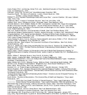 Harris, Robert, Ph. D., and Karmas, Ednel, Ph. D., eds. Nutritional Evaluation of Food Processing. Westport, Conn.: Avi Publishing Co., 1975. Hartmann, Yanny Ting.“ Hot and Cold.” Unpublished paper, December 1983. Hauschka, Rudolf. The Nature of Substance. London: Vincent Stuart Ltd., 1966. _________. Nutrition. London: Stuart & Watkins, 1967. Herman, C., et al.“ Soybean Phytoestrogen Intake and Cancer Risk.” Journal of Nutrition 125, supp. 3( March 1995): 757S – 770S. Hildebrand, Milton. Analysis of Vertebrate Structure. New York: John Wiley, 1974. Hoffman, Enid. Huna— A Beginner’ s Guide. Gloucester, Mass.: Para Research, 1976. Horowitz, Benson J., M. D.; Epstein, Stanley W., M. D.; and Lippman, Leonard, M. D.“ Sugar Chromatography Studies in Recurrent Candida Vulvovaginitis.” Journal of Reproductive Medicine 29, no. 1( July 1984). Hunter, Beatrice Trum. Fact-Book on Fermented Foods and Beverages: An Old Tradition. New Canaan, Conn.: Keats Publishing Co., 1973. Illich, Ivan. Medical Nemesis— The Expropriation of Health. New York: Pantheon Books, 1976. International College of Applied Nutrition. Nutrition, Applied Personally. La Habra, Calif.: International College of Applied Nutrition, 1973. Quoted by Karen MacNeil, The Book of Whole Foods, Nutrition and Cuisine. Jackson, Mildred, N. D., and Teague, Terri. The Handbook of Alternatives to Chemical Medicine. Oakland, Calif.: Lawton-Teague Publications, 1975. Jacob, Stanley W., M. D., F. A. C. S.; Francone, Clarice Ashworth; and Lossow, Walter J., Ph. D. Structure and Function in Man. Philadelphia: W. B. Saunders Co., 1982. Jacobson, Michael. Eater’ s Digest: The Consumer’ s Fact Book of Food Additives. New York: Anchor Books / Doubleday, 1976. Jain, K. K. Health Care in New China and What We Can Learn From It. Emmaus, Pa.: Rodale Press, 1973. Kaptchuk, Ted J., O. M. D. The Web That Has No Weaver: Understanding Chinese Medicine. New York: Congdon & Weed, 1983. Kaslof, Leslie J.“ Parts or Wholes: An Introduction to the Use of Whole Plant Substances in Healing.” In Wholistic Dimensions in Healing: A Resource Guide. Leslie J. Kaslof, ed. Garden City, N. Y.: Doubleday & Co., 1978. Keeton, William T. Biological Science. New York: W. W. Norton, 1980. Keller, Jeanne. Healing with Water. West Nyack, N. Y.: Parker Publishing Co., 1968. Kelley, William Donald, M. D., D. D. S.“ Dr. Kelley’ s Self Test for the Different Metabolic Types.” Healthview Newsletter( Charlottesville, Va.), 1977. Kelley, William, M. S., D. D. S. Metabolic Typing. Winthrop, Wash.: International Health Institute, 1982. Kervran, Louis. Biological Transmutations. Binghamton, N. Y.: Swan House Publishing Co., 1972. Kloss, Jethro. Back to Eden. New York: Lancer Books, 1971. Kosland, D. E., Jr.“ Protein Shape and Biological Control.” Scientific American, October 1973. Kotsch, Ronald E., Ph. D.“ Georges Ohsawa and the Japanese Religious Tradition— A Study of the Life and Thought of the Founder of Macrobiotics.” Doctoral thesis, Harvard School of Divinity. North Chelmsford, Mass.: Sorbengeist Publications, 1981.“ Kudzu Extract Shows Potential for Moderating Alcohol Abuse.” American Journal of Hospital Pharmacy 51, no. 6( March 15, 1994): 750. Kushi, Michio. The Book of Macrobiotics— The Universal Way of Health and Happiness. Tokyo: Japan Publications, 1977. _________. How to See Your Health: The Book of Oriental Diagnosis. Tokyo: Japan Publications, 1980. _________. Natural Healing Through Macrobiotics. Tokyo: Japan Publications, 1984; first published as The Macrobiotic Way of Natural Healing, edited by Eduard Esko. Boston, Mass.: East West Publications, 1978. Langley, I. L., Ph. D.: Telfor, Ira, Ph. D.; and Christensen, John B., Ph. D. Dynamic Anatomy and Physiology. New York: McGraw-Hill, 1964. Lappé, Frances Moore. Diet for a Small Planet. New York: Ballantine Books, 1975. Laszlo, Erno. Introduction to Systems Philosophy. New York: Harper & Row, 1972. Leaf, Alexander, M. D.“ Every Day Is a Gift If You’ re Over 100,” National Geographic, January 1973. Levy, Jerre.“ Sex and the Brain.” A review of Sexual Differentiations of the Brain, by Robert W. Goy and Bruce McEwen. The Sciences, March 1981. Lewison, Edwin F.“ An Appraisal of Long-Term Results in Surgical Treatment of Breast Cancer.” Journal of the American Medical Association 186( 1963): 975 – 78. Liem, Irene T. H.; Sternkraus, Keith H.; and Cronk, Ted C.“ Production of Vitamin B 12 in Tempeh.” Applied and Environmental Microbiology, December 1977. Liener, I. E.“ Possible Adverse Effects of Soybean Anticarcinogens.” Journal of Nutrition 125, supp. 3( March 1995): 744S – 750S. Longgood, William. The Poisons in Your Food. New York: Grove Press, 1960.