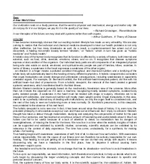 HOLISM It has become increasingly obvious that our exciting modern lifestyle has made us very unhealthy. We are also coming to realize that the technical and chemical medicine developed to treat our health problems is not only often ineffective, but has many drawbacks as well. As a result, a countermovement has arisen out of our discontent, a healing movement loosely termed“ wholism,” or“ holism,” which in turn has given us“ holistic medicine” and“ holistic health.” A holistic view of the human body recognizes that its function is affected by a variety of factors, both internal and external, such as food, drink, exercise, emotions, stress, and so on. It recognizes that disease symptoms express a total condition of the organism. Our individual body parts are all components of an integrated physical being who also exists on social, emotional, and spiritual levels; people are part of families, tribes, societies. In terms of illness, a weakness in the heart expresses a weakness of the other organs; an infection in a finger means a polluted condition throughout; and improved nutrition and a tonifying of the whole body will automatically lead to the healing of many different symptoms. A holistic viewpoint also considers that organ transplants can create strange and unforeseen consequences, including weaknesses in apparently unrelated organs. For example, Dr. Bernard Kornfeld, the first artificial-heart-transplant patient, did fine with his artificial heart— but died of pneumonia. From a holistic viewpoint, the removal of the heart created a general systemic weakness, which manifested itself in the fatal illness. Modern Western medicine is generally based on the mechanistic, Newtonian view of the universe. More often than not it treats the organism as if it were a machine, recognizing mostly isolated symptoms, isolated body parts, isolated people. A weakness in the heart must be treated with drugs or surgery, infections are to be stopped with antibiotics, and improved nutrition will mostly mean weight control. Organ transplants, in this view, seem to be a perfectly rational way of dealing with malfunctions, as only the organ itself is considered sick, and the rest of the body is seen as functioning more or less normally. Dr. Kornfeld’ s pneumonia, in this viewpoint, was unrelated to the absence of his real heart. The holistic viewpoint is not a new one. In fact, it has been around since the dawn of history. It is, even now, the prevalent philsophy in all societies except our own and those we’ ve influenced. But I imply no criticism: Western thought has taken a detour through materialism, studying and analyzing the components of matter for the past three or four centuries, and has learned an enormous amount of fascinating and useful details about it. Much as holism can fail to be useful because of a lack of attention to detail, so materialism has its dangers of nearsightedness, of missing the forest for the trees. We now live in a time when the realistic insights of holism can be supported and validated by scientific studies; conversely, scientific analysis can be validated by its relevance in the context of daily experience. The time has come, undoubtedly, for a synthesis, for making whole— for healing. True healing begins with awareness: awareness of self, first of all, to discover how we function. With awareness comes responsibility. We are the cause of our illness and can therefore be actively responsible for our own healing. True healing is not just getting rid of a headache— we can do that very simply with aspirin. It means discovering why we have a headache in the first place, how to disperse it without causing harm elsewhere— aspirin cures the headache and hurts the stomach, an exchange that has its drawbacks— and how to avoid headaches in the future. To live up to our responsibility, we need information, both theoretical and practical, to help us decide what to do. Let’ s begin by discussing the larger underlying concepts and then narrow the discussion to specific and personal areas of concern. First, the systems theory of how our body works. It is the scientific support for, the validation of, holism. We need to understand it fully in order to practice the holistic approach to health effectively. LIVING SYSTEMS Concepts of how our body works changed when doctors started getting their metaphors from the work of mechanics and craftsmen with the onset of the Industrial Revolution.“ The heart could be seen as a pump only when such engines began to be widely exploited in sixteenth-century mining, fire-fighting, and civil engineering,” writes Jonathan Miller. 1 Seeing the body in terms of its mechanical functions came to be considered a much more sensible and practical
