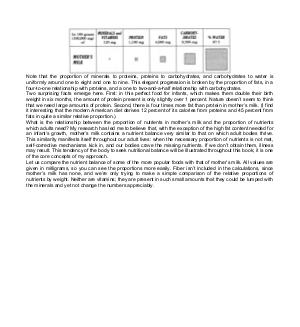 Note that the proportion of minerals to proteins, proteins to carbohydrates, and carbohydrates to water is uniformly around one to eight and one to nine. This elegant progression is broken by the proportion of fats, in a four-to-one relationship with proteins, and a one to two-and-a-half relationship with carbohydrates. Two surprising facts emerge here. First: in this perfect food for infants, which makes them double their birth weight in six months, the amount of protein present is only slightly over 1 percent. Nature doesn’ t seem to think that we need large amounts of protein. Second, there is four times more fat than protein in mother’ s milk.( I find it interesting that the modern American diet derives 12 percent of its calories from proteins and 45 percent from fats in quite a similar relative proportion.) What is the relationship between the proportion of nutrients in mother’ s milk and the proportion of nutrients which adults need? My research has led me to believe that, with the exception of the high fat content needed for an infant’ s growth, mother’ s milk contains a nutrient balance very similar to that on which adult bodies thrive. This similarity manifests itself throughout our adult lives: when the necessary proportion of nutrients is not met, self-corrective mechanisms kick in, and our bodies crave the missing nutrients. If we don’ t obtain them, illness may result. This tendency of the body to seek nutritional balance will be illustrated throughout this book; it is one of the core concepts of my approach. Let us compare the nutrient balance of some of the more popular foods with that of mother’ s milk. All values are given in milligrams, so you can see the proportions more easily. Fiber isn’ t included in the calculations, since mother’ s milk has none, and we’ re only trying to make a simple comparison of the relative proportions of nutrients by weight. Neither are vitamins; they are present in such small amounts that they could be lumped with the minerals and yet not change the numbers appreciably.