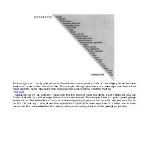 Each category also has its graduations, and sometimes more expansive foods of one category are on the same level as more ontractive ones of another. For example, although plant foods are more expansive than animal foods generally, some fish can be more expansive than cooked grains. Read the chart on this page horizontally as well as vertically. Please note that this listing of foods and drinks is not a static list. Any one food or drink will have various expansive and contractive features. For example, there are upward-growing large leaves with a bitter taste( Swiss chard), or downward-growing large roots with a sweet taste( carrots), and so on. For this reason you may at one time experience a foodstuff as more expansive, at another time as more contractive. But on the whole the list should provide you with solid guidelines and is generally applicable. *