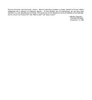 Psyche and soma, mind and body— mirrors. Mind, by intending, operates on matter, method not known. Matter disappears into a glimmer of subatomic ghosts.… If final answers are not forthcoming, we can take more interest in our own experiences and ideas. Our questions can be reframed in terms of esthetics and practicality. Not“ Is it true?” but“ Does it fit?” Not“ What is real?” but“ Does it work?”
