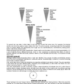 To support any one state, it often helps to eat food from around the same zone. For example, for physical activity, eat more fruit, greens, tubers, stalks, fish, fowl. To curb an excess, consuming foods from the opposite zone is at times helpful: the hyperactivity from sugar can be counterbalanced or eliminated by eating grains, beans, salty foods, animal protein. Please remember that this whole classification, though useful, must be taken only as a broad generalization. It’ s a sort of relativity theory: different foods are more or less expansive or contractive than others. In order to maintain balance, we need both kinds; neither is better or more desirable than the other. It is important to keep that in mind. ACID AND ALKALINE Although nutrition books frequently refer to“ acid” and“ alkaline,” the concept of acidity and alkalinity remains one of the most incompletely understood in nutritional science. Understanding it, however, is crucial to knowing how to keep ourselves balanced. First, some basic facts. Acidity and alkalinity are properties exhibited most clearly in fluids. They are opposites, in the sense that we have defined earlier: necessary and complementary to each other, two faces of a coin, neither one being“ better” or“ worse” than the other. The main characteristic of acids is that they contain a large proportion of hydrogen ions( H +), which have a positive electric charge. Hydrogen atoms normally have one proton in their nucleus and one electron spinning around it; as with all elements, the number of protons and the number of electrons are usually equal. When the number of electrons is either larger or smaller, the atom is called an ion.