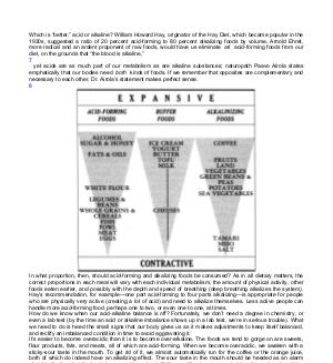 Which is“ better,” acid or alkaline? William Howard Hay, originator of the Hay Diet, which became popular in the 1930s, suggested a ratio of 20 percent acid-forming to 80 percent alkalizing foods by volume. Arnold Ehret, more radical and an ardent proponent of raw foods, would have us eliminate all acid-forming foods from our diet, on the grounds that“ the blood is alkaline,” 7 yet acids are as much part of our metabolism as are alkaline substances; naturopath Paavo Airola states emphatically that our bodies need both kinds of foods. If we remember that opposites are complementary and necessary to each other, Dr. Airola’ s statement makes perfect sense. 8
