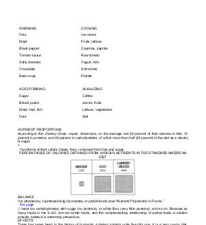 BALANCE It is attained by counterpointing incomplete, or partial foods( see“ Nutrient Proportions in Foods,” this page): meat( no carbohydrates) with sugar( no proteins), or white flour( very little proteins), and so on. Because so many foods in the S. A. D. are not whole foods, and the complementary relationship of partial foods is seldom precise, balance is extremely precarious. EFFECTS There has never been in the history of humanity a dietary system quite like this one. It is a very young diet, maybe a couple of hundred years old in some of its elements( bacon and eggs), thirty or forty in others( freezedried coffee, breakfast cereals, powdered artificial drinks). One of its interesting effects is the same as noted in traditional societies that have abruptly changed their eating habits: Because the food eaten by the children is often different from what their parents ate in their own youth, and the food consumed by pregnant women is totally different from what their own grandmothers traditionally ate, intra- and extra-uterine environmental influences are overriding heredity. 2 The physical aspect of younger generations is changing so dramatically that often children do not resemble