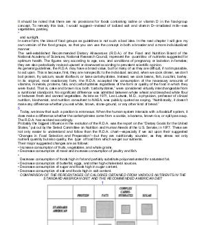 It should be noted that there are no provisions for foods containing iodine or vitamin D in the food-group concept. To remedy this lack, I would suggest— instead of iodized salt and vitamin D— irradiated milk— sea vegetables, parsley, * and sunlight. In some form, the idea of food groups as guidelines is not such a bad idea. In the next chapter I will give my own version of the food groups, so that you can use the concept in both a broader and a more individualized manner. The well-established Recommended Dietary Allowances( R. D. A.) of the Food and Nutrition Board of the National Academy of Sciences, National Research Council, represent the quantities of nutrients suggested for optimum health. The figures vary according to age, sex, and conditions of pregnancy or lactation in females; they are also periodically revised upward or downward according to prevalent scientific opinion. As general guidelines, the R. D. A. may have a broad value, but for many of us they are difficult, if not impossible, to act upon. This is because, first, they are nonspecific to the individual; second, when we cook dinner, we don’ t boil protein, fry calcium, sauté riboflavin, or bake carbohydrates. Instead, we cook beans, fish, zucchini, barley. In its original, most reactionary form, the R. D. A. accepted the consumption of the necessary amounts of vitamins, minerals, proteins, fats, and carbohydrates regardless of the form or quality of the food in which they were found. That is, cake and brown rice, both“ carbohydrates,” were considered virtually interchangeable from a nutritional standpoint. No significant difference was admitted between whole wheat and bleached white flour or between fresh and canned vegetables. As late as 1971, Leo Lutwak, M. D., a physician, professor of clinical nutrition, biochemist, and nutrition consultant to NASA, was publicly quoted as saying,“ Nutritionally, it doesn’ t make any difference whether you eat white, brown, stone-ground, or any other kind of bread.” 5 Today, we know that such a position is erroneous. When the human system interacts with a foodstuff system, it does make a difference whether the carbohydrates come from a cookie, a banana, brown rice, or split pea soup. The R. D. A. has evolved accordingly. Probably the biggest influence in the evolution of the R. D. A. was the report on the“ Dietary Goals for the United States,” put out by the Select Committee on Nutrition and Human Needs of the U. S. Senate, in 1977. These are not only easier to understand and follow than the R. D. A. chart— especially if we act upon their suggested“ Changes in Food Selection and Preparation”— but they are nutritionally sounder, as they stress not only nutrient quantity but also quality, the type of food from which we get our nutrients. Their major suggested changes are as follows: