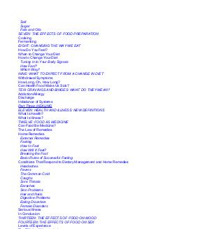 Salt Sugar Fats and Oils SEVEN: THE EFFECTS OF FOOD PREPARATION Cooking Fermenting EIGHT: CHANGING THE WAY WE EAT How Do You Feel? When to Change Your Diet How to Change Your Diet Tuning in to Your Body Signals How Fast? Which Way? NINE: WHAT TO EXPECT FROM A CHANGE IN DIET Withdrawal Symptoms How Long, Oh, How Long? Can Health Food Make Us Sick? TEN: CRAVINGS AND BINGES: WHAT DO THEY MEAN? Addiction / Allergy Discharge Imbalance of Systems Part Three: HEALING ELEVEN: HEALTH AND ILLNESS: NEW DEFINITIONS What Is Health? What Is Illness? TWELVE: FOOD AS MEDICINE Can Food Be Medicine? The Law of Remedies Home Remedies External Remedies Fasting How to Fast How Will It Feel? Breaking the Fast Basic Rules of Successful Fasting Conditions That Respond to Dietary Management and Home Remedies Headaches Fevers The Common Cold Coughs Sore Throats Earaches Skin Problems Hair and Nails Digestive Problems Eating Disorders Female Disorders Serious Illness In Conclusion THIRTEEN: THE EFFECTS OF FOOD ON MOOD FOURTEEN: THE EFFECTS OF FOOD ON SEX Levels of Experience The Effects of Vegetarianism The Effects of Sugar and Dairy The Effects of a Change in Diet Food for Men and Women: Should It Be Different? FIFTEEN: A HEALTH NUT IN THE HOSPITAL A Proposal for Unifying the Opposites Afterword Dedication Acknowledgments