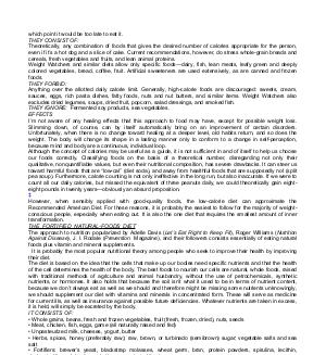 which point it would be too late to eat it. THEY CONSIST OF: Theoretically, any combination of foods that gives the desired number of calories appropriate for the person, even if it’ s a hot dog and a slice of cake. Current recommendations, however, do stress whole-grain breads and cereals, fresh vegetables and fruits, and lean animal proteins. Weight Watchers and similar diets allow only specific foods— dairy, fish, lean meats, leafy green and deeply colored vegetables, bread, coffee, fruit. Artificial sweeteners are used extensively, as are canned and frozen foods. THEY FORBID: Anything over the allotted daily calorie limit. Generally, high-calorie foods are discouraged: sweets, cream, sauces, eggs, rich pasta dishes, fatty foods, nuts and nut butters, and similar items. Weight Watchers also excludes dried legumes, soups, dried fruit, popcorn, salad dressings, and smoked fish. THEY IGNORE: Fermented soy products, sea vegetables. EFFECTS I’ m not aware of any healing effects that this approach to food may have, except for possible weight loss. Slimming down, of course, can by itself automatically bring on an improvement of certain disorders. Unfortunately, when there is no change toward healing at a deeper level, old habits return, and so does the weight. The body will change its shape in a lasting manner only to conform to a change in self-perception, because mind and body are a continuous, individual loop. Although the concept of calories may be useful as a guide, it is not sufficient in and of itself to help us choose our foods correctly. Classifying foods on the basis of a theoretical number, disregarding not only their qualitative, nonquantifiable values, but even their nutritional composition, has severe drawbacks. It can steer us toward harmful foods that are“ low-cal”( diet soda), and away from healthful foods that are supposedly not( split pea soup). Furthermore, calorie counting is not only ineffective in the long run, but also inaccurate. If we were to count all our daily calories, but missed the equivalent of three peanuts daily, we could theoretically gain eighteight pounds in twenty years— obviously an absurd proposition. ‡ However, when sensibly applied with good-quality foods, the low-calorie diet can approximate the Recommended American Diet. For these reasons, it is probably the easiest to follow for the majority of weightconscious people, especially when eating out. It is also the one diet that requires the smallest amount of inner transformation. THE FORTIFIED NATURAL-FOODS DIET The approach to nutrition popularized by Adelle Davis( Let’ s Eat Right to Keep Fit), Roger Williams( Nutrition Against Disease), J. I. Rodale( Prevention Magazine), and their followers consists essentially of eating natural foods plus vitamin and mineral supplements. It is probably the most popular nutritional theory among people who seek to improve their health by improving their diet. The diet is based on the idea that the cells that make up our bodies need specific nutrients and that the health of the cell determines the health of the body. The best foods to nourish our cells are natural, whole foods, raised with traditional methods of agriculture and animal husbandry, without the use of petrochemicals, synthetic nutrients, or hormones. It also holds that because the soil isn’ t what it used to be in terms of nutrient content, because we don’ t always eat as well as we should and therefore might be missing some nutrients unknowingly, we should supplement our diet with vitamins and minerals in concentrated form. These will serve as medicine for current ills, as well as insurance against possible future deficiencies. Whatever nutrients are taken in excess, it is held, will simply be excreted by the body. IT CONSISTS OF: