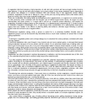 A vegetarian diet that includes a high proportion of milk and milk products will have enough buildup foods to keep balance. It may sit well with some people, but in many others it may cause metabolic havoc, especially if the person has allergies or is lactose intolerant. Milk and cheese may in fact aggravate various allergy problems, regardless of what one is“ allergic to.” Also, as they are very strong buildup foods( milk makes calves grow into cows!), they may cause unwanted weight gain. There are, incidentally, few eating habits as damaging as strict vegetarianism, or veganism( no animal protein, no milk products), when combined with the frequent use of refined sugar and / or honey. As sugar is a pure carbohydrate and lacks protein, in a vegan diet it will set up a relative protein deficiency, and thereby be weakening. Scientific evidence backs up this contention. In a detailed study conducted by Dr. C. Keith Conners of Children’ s Hospital in Washington, D. C., it was shown that a combination of a carbohydrate meal and a sugary food was“ deadly” in its effects on learning ability and behavior, whereas sugar following a( animal) protein meal did not have such a negative effect. 20 Well-balanced vegetarian eating, when a person is suited for it, is extremely healthful. Studies done on vegetarian groups such as the Seventh Day Adventists show a much lower incidence of cancer than in meateating populations. 21 A diet high in vegetable protein and correspondingly low in saturated fat is also positively correlated with clean coronary arteries. A raw-foods vegetarian diet, even though it may include nuts and even soaked grains, is strongly tilted toward aiding breakdown because of its low protein and fat content. It’ s an extremely helpful way of eating when we wish to get rid of excess mucus, fat, or any sort of deposited matter in tissues, blood vessels, or joints. It is also extremely cooling. Most people I know who successfully follow a raw-food regimen live in a warm climate, such as Florida or California. Those who live in New York and other northern cities reported becoming very cold in the winter; they warmed up quickly as soon as they started eating cooked buildup foods, such as grains and beans. COMMENTS Vegetarians are often interested in spiritual development, meditation, and the transcendental view of life— that is, the understanding that there is another reality beyond the material world. § It is also popularly believed that vegetarians are peaceful, whereas meat eaters are bloodthirsty and even warlike. According to my observations, this bears out only partially. A well-balanced vegetarian way of eating, when coupled with an altruistic predisposition, can indeed support a peaceful and friendly character. But there are no guarantees: Cain, the tiller of the ground( perhaps a vegetarian?) killed Abel, the keeper of sheep( a meat eater?). Hitler was a committed vegetarian from 1911 until his death thirty-four years later. His case, in fact, is a dramatic illustration of unbalanced vegetarianism: He lived on fruits, vegetables, potatoes, milk, white rice, chocolate, and enormous amounts of sugar and white flour in the form of pastries and cakes. 23 Considering less extreme examples, I have seen many a contentious, cranky vegetarian— myself included at times— and many a kind and patient meat eater. After all, if the“ you are what you eat” cliché is true, when you eat beef you become like the cow— not like the butcher. This point was brought home to me on a five-hour plane trip I took with my children when they were three and six years old, and very lively. I dreaded the confinement and was prepared with healthy snacks, toys, and plenty of crayons. When lunchtime came, the only thing on the menu turned out to be beef bourguignon; the kids were hungry and demanded“ airplane food,” so with great trepidation and visions of little savages dancing in my head, I let them order it. Much to my surprise, after the meat meal they were quite relaxed and content, played quietly with their books and crayons, and even allowed me a nap! I found out later that one of the amino acids in meat, tryptophan, tends to induce relaxation and sleepiness. Some people are natural vegetarians, practically since birth, and both the thought and the act of eating animal products is quite repugnant to them; they usually remain in excellent health on a simple vegetarian regime. On the other hand, there are people who cannot follow a vegetarian way of eating without becoming weak, getting depressed, losing energy, weight, hair, the“ creative edge,” and feeling generally deprived. Still others go in and out of vegetarian phases. There are a number of theories that classify the body into various types so as to help us decide what kinds of foods work best for each of us. One theory, which according to some who have tried it is fairly effective, says that body types with strong adrenals do very well on a vegetarian, no-sugar diet, whereas those with strong pituitary-gland activity cannot handle a vegetarian diet too well— they need animal protein. 24 Another theory holds that people with strong, active endocrine systems, a high rate of metabolism, lean bodies, and a liking for exercise do well with large amounts of vegetables and fruits, whereas people with weaker endocrine systems, a slow metabolic rate, and the tendency to put on weight would be uncomfortable on a vegetarian diet and do better with a fair amount of animal protein.