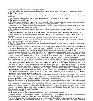 rye, corn, bulgur, popcorn, kasha, whole-grain bread b. Starchy tubers( two or three servings per week— optional): yams, manioc, yautias, and other similar foods 2. The Protein Group: a. Dry beans and peas( one or two servings daily): split peas, lentils, chick-peas, kidney beans, aduki beans, and so on b. Animal-protein foods( one to five servings per week— optional): fish, fowl, eggs, meat 3. The Vitamin / Mineral Group: a. The leafy green vegetables( one or two servings daily): kale, collards, mustard greens, dandelion, chard, turnip tops( all cooked), lettuce, parsley, dill, escarole, chicory, watercress( all raw) b. The roots and squashes( one or two servings daily): turnips, parsnips, carrots, rutabaga, butternut squash, acorn squash, radishes, and similar foods c. General vegetables( one or two servings daily): celery, broccoli, green beans, cauliflower, onions, leeks, scallions d. The sea vegetables( two to five servings per week): dulse, irish moss, agar, kelp, hiziki, and similar foods e. The nightshades( two to three servings per week if diet includes some dairy): potatoes, tomatoes, eggplant, peppers f. Fresh or cooked fruits( one or two servings daily according to season— between meals for raw fruit) 4. The Lactobacillus Group( three to five servings per week): fermented foods, such as pickles, sauerkraut, miso, tempeh, fermented-milk products( optional) 5. The Fun-Foods Group( weekends, parties, special occasions): milk, cheese, alcohol, chocolate, sugar, paté, fried foods, and such Note: It is especially important to remember that in a dietary system that includes a considerable proportion of complex carbohydrates, good and thorough chewing is essential. Digestion of carbohydrates begins with the enzyme ptyalin( or salivary amylase) in the saliva. If the food is not in the mouth long enough for the salivary amylase to do its job, the burden falls on the pancreatic amylase in the duodenum. Most people’ s pancreases— and especially those of sugar-eaters— are simply not up to this task. The result will be sensations of bloating and gas, general discomfort, and of course disillusionment with the“ healthy” diet. So please remember: CHEW EVERY BITE UNTIL IT IS THOROUGHLY INSALIVATED— thirty-five to forty times. The health-supportive way of eating, by definition, is goal-oriented and therefore would inevitably be somewhat different for each of us. The guidelines given here and in chapter eight,“ Changing the Way We Eat,” are, I think, broad enough to cover most individual needs and conditions. They provide the general principles by which you can orient yourself. The details, however— whether, for example, you should eat a bowl of beans or a piece of meat today— must be worked out individually by each person. They will also change continuously over time as our bodies— and our minds— change. The goal must be kept in mind at all times: What are we watching our diet for? Are we becoming the kind of person we want to be? Is it working? I cannot stress enough the importance of flexibility and adaptability to change. A rigid dictum, strict rules to follow, and a list of“ allowed” and“ forbidden” foods have no place in the health-supportive diet. Following such an eating style demands self-determination, free will, and accepting responsibility for our choices. It engages our creativity and our intelligence. It allows for growth, change, discovery, and continuous learning, all of which make it not easy, but very interesting and even exciting. Caution: The comments on the effects of food on our health, as delineated in this and the next chapter, do not take into account the possibility that you might be taking medications. Everything changes if that is the case, in ways unpredictable and devastating. Many prescription or over-the-counter medications increase excretion or decrease absorption of nutrients, and natural, healthy food might not have much of a medicinal effect. To read more on this subject, please refer to the Handbook: Interactions of Selected Drugs with Nutritional Status in Man, from the American Dietetic Association. Eating Out: How to Manage Eating a healthy diet can be a challenge for those of us who are always on the run.“ I work all day long,” you’ re probably thinking,“ I don’ t have time to cook! Not only that, I like to eat out four or five times a week, maybe more. How can I find whole grains in the coffee shop?” Another problem is that our human lifestyle is very complicated. Something as basic as eating has taken on a myriad of subtle nuances and become, thereby, a mode of communication. In our society, if we order sushi, our meal companions will have a totally different sense of us than if we order pot roast. Russell Baker, whose satirical essays regularly appear in the New York Times, once wrote a delightfully wry yet oddly truthful piece entitled“ Power Lunching,” in which ordering raw alligator steak and turnips was seen as an expression of power! How would it look in a business lunch if you just had soup, salad, and mineral water? Let’ s deal with both these problems— matter and mind— one at a time. On the question of what to eat, try these simple rules: