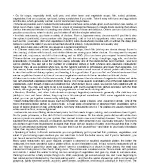 • In Chinese restaurants, mixed vegetables, noodles, scallops, fresh fish( shrimp are almost always frozen in this country), chicken with broccoli, and similar dishes are among your better choices. You may want to request reduced salt, soy sauce, and oil in the cooking and no MSG.( You can have your request honored because Chinese dishes are generally cooked to order, with the exception of soup, dumplings, egg rolls, and similar preparations.) If possible, avoid the egg foo young, probably one of the oiliest dishes ever invented— your liver will be grateful. You can get a fair number of vegetarian dishes in both Chinese and Japanese restaurants; however, they all use polished white rice, so the nutrient content is off balance and lower than desirable. For that reason, these meals are really better balanced if you have a small amount of animal protein with them; that is also the traditional dietary system, and heeding it is a good idea. If you can find an Oriental restaurant that serves unpolished brown rice, then of course a vegetarian meal would be an excellent nutritional choice.