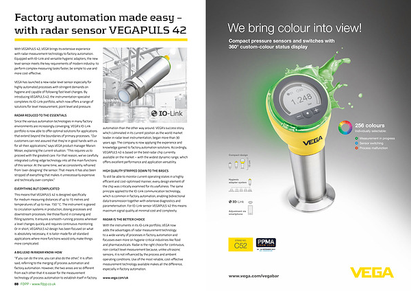 With VEGAPULS 42 , VEGA brings its extensive experience with radar measurement technology to factory automation . Equipped with IO-Link and versatile hygienic adapters , the new level sensor meets the key requirements of modern industry : to perform complex measuring tasks faster , be simple to use and more cost-effective .