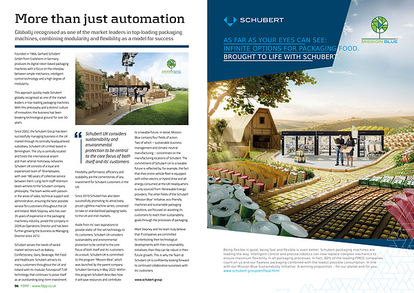 Being flexible is good , being fast and flexible is even better . Schubert packaging machines are leading the way . Intelligent control and precise robotics can now replace complex mechanics to ensure maximum flexibility in all packaging processes . In fact , 80 % of the leading FMCG companies count on us and our flawless packaging combined with the lowest possible consumption . In line with our Mission Blue Sustainability Initiative : A winning proposition – for our planet and for you . www . schubert . group / en / food . html