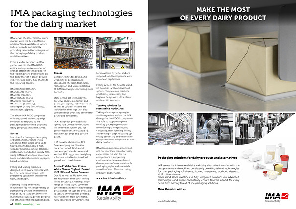 IMA serves the international dairy and dairy alternative industries with the best platforms and machines , consistently providing tailored technologies for the packaging of cheese , butter , margarine , yoghurt , desserts , UHT milk and more . From stand-alone machines to fully-integrated solutions , our advanced technologies and expert consultancy ensure tailored support for every need , from primary to end of line packaging solutions .