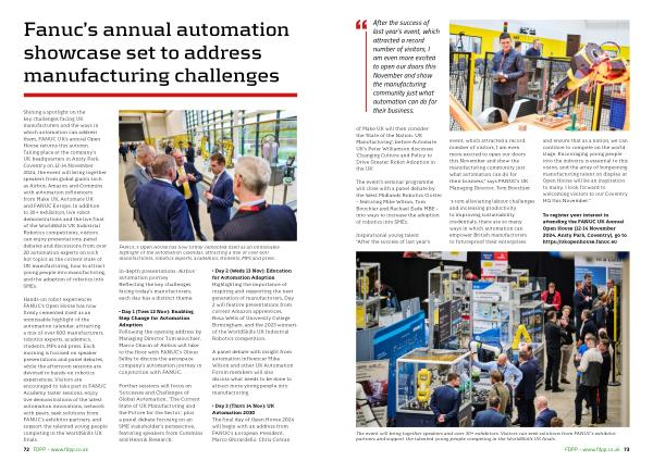 Shining a spotlight on the key challenges facing UK manufacturers and the ways in which automation can address them , FANUC UK ’ s annual Open House returns this autumn . Taking place at the company ’ s UK headquarters in Ansty Park , Coventry on 12-14 November 2024 , the event will bring together speakers from global giants such as Airbus , Amazon and Cummins with automation influencers from Make UK , Automate UK and FANUC Europe . In addition to 30 + exhibitors , live robot demonstrations and the live final of the WorldSkills UK Industrial Robotics competitions , visitors can enjoy presentations , panel debates and discussions from over 20 automation experts on such hot topics as the current state of UK manufacturing , how to attract young people into manufacturing , and the adoption of robotics into SMEs .