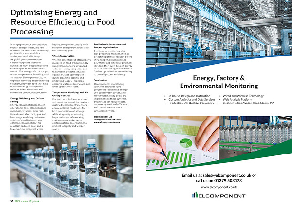 Conclusion Elcomponent ’ s monitoring solutions empower food processors to optimise energy use , conserve resources , and meet sustainability goals . By implementing these systems , businesses can reduce costs , improve operational efficiency , and contribute to a more sustainable future .