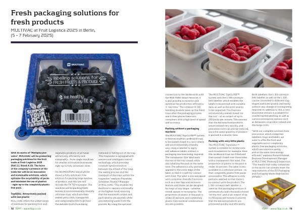 With its motto of “ Multiply your value “, MULTIVAC will be presenting packaging solutions for the fruit trade at Fruit Logistica 2025 ( Hall 2.1 , Stand A 10 ). The focus of the company ’ s presence at the trade fair will be on innovative and sustainable solutions , which optimise the recyclability of packs and minimise the use of plastics – right up to the completely plasticfree pack .