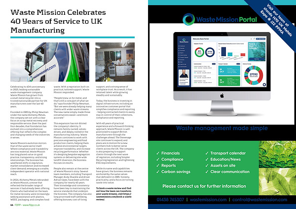 Celebrating its 40th anniversary in 2025, leading sustainable waste management company Waste Mission has grown from a small metal recycler into a trusted nationwide partner for UK manufacturers over the last 40 years.