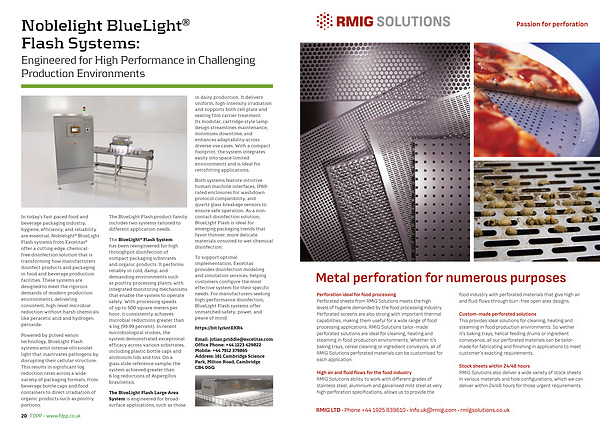 In today’ s fast-paced food and beverage packaging industry, hygiene, efficiency, and reliability are essential. Noblelight ® BlueLight Flash systems from Excelitas ® offer a cutting-edge, chemicalfree disinfection solution that is transforming how manufacturers disinfect products and packaging in food and beverage production facilities. These systems are designed to meet the rigorous demands of modern production environments, delivering consistent, high-level microbial reduction without harsh chemicals like peracetic acid and hydrogen peroxide.