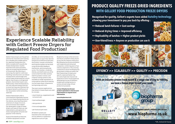 Biopharma Group is the exclusive distributor of Gellert freeze dryers across the UK, Ireland, and France. Both Biopharma Group and Gellert well respected and renowned companies, combining years of lyo industry experience. This winning combination allows the Biopharma group team to help you select the best freeze dryer to meet your specific need and Gellert has accrued a high level of practical experience and in-house expertise, developing an array of different models and configurations to satisfy a broad range of food production purposes.