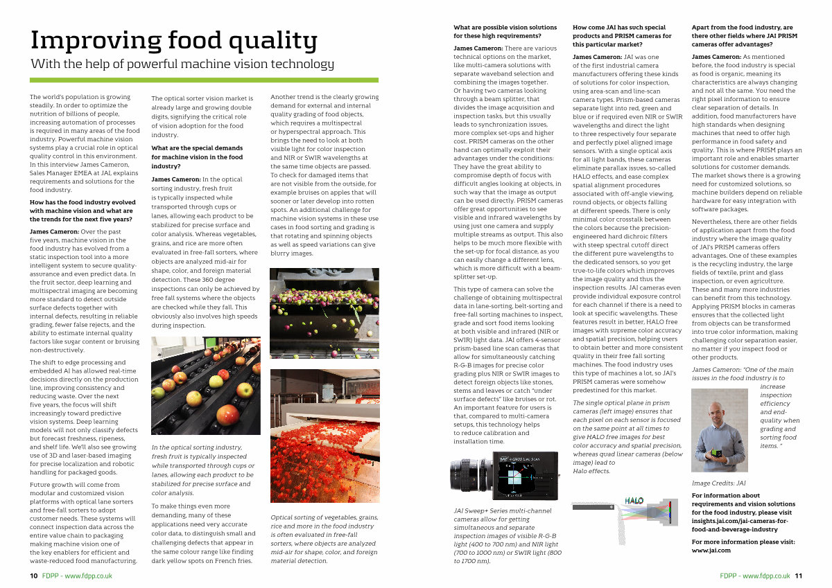 James Cameron: JAI was one of the first industrial camera manufacturers offering these kinds of solutions for color inspection, using area-scan and line-scan camera types. Prism-based cameras separate light into red, green and blue or if required even NIR or SWIR wavelengths and direct the light to three respectively four separate and perfectly pixel aligned image sensors. With a single optical axis for all light bands, these cameras eliminate parallax issues, so-called HALO effects, and ease complex spatial alignment procedures associated with off-angle viewing, round objects, or objects falling at different speeds. There is only minimal color crosstalk between the colors because the precisionengineered hard dichroic filters with steep spectral cutoff direct the different pure wavelengths to the dedicated sensors, so you get true-to-life colors which improves the image quality and thus the inspection results. JAI cameras even provide individual exposure control for each channel if there is a need to look at specific wavelengths. These features result in better, HALO free images with supreme color accuracy and spatial precision, helping users to obtain better and more consistent quality in their free fall sorting machines. The food industry uses this type of machines a lot, so JAI’ s PRISM cameras were somehow predestined for this market.