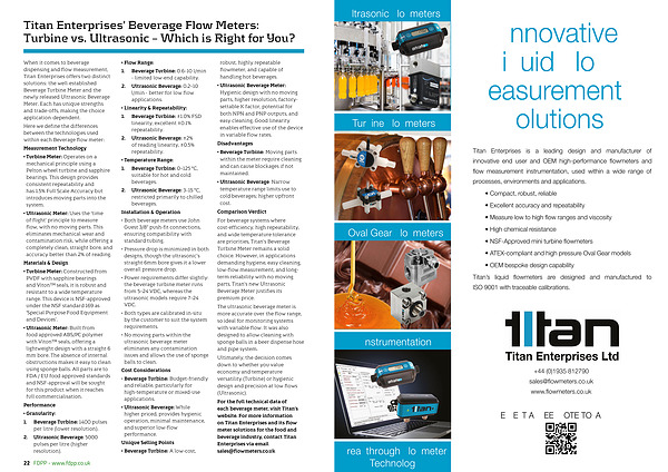 For the full technical data of each beverage meter, visit Titan’ s website. For more information on Titan Enterprises and its flow meter solutions for the food and beverage industry, contact Titan Enterprises via email sales @ flowmeters. co. uk