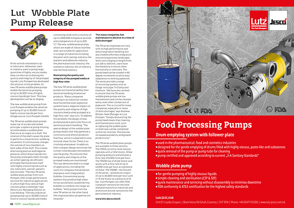 62 FDPP- www. fdpp. co. uk containing solids with a viscosity of up to 1,000,000 millipascal seconds and a temperature of up to 205 ° C.” The new wobble plate pumps, which are made of robust stainless steel, are suitable for application in a range of industries including the paint and coatings industry, the sealants and adhesives industry, the pharmaceuticals industry, the cosmetics industry, the oil industry and the food industry.