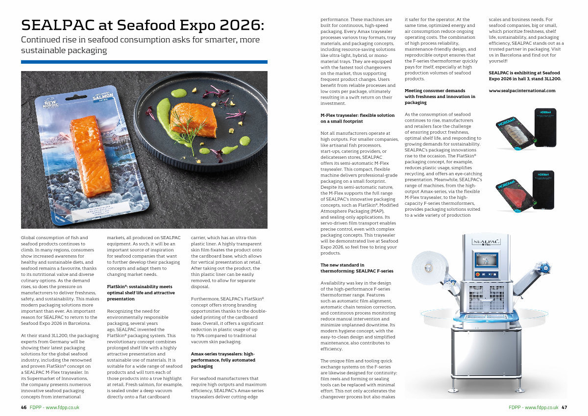 Not all manufacturers operate at high outputs. For smaller companies, like artisanal fish processors, start-ups, catering providers, or delicatessen stores, SEALPAC offers its semi-automatic M-Flex traysealer. This compact, flexible machine delivers professional-grade packaging on a small footprint. Despite its semi-automatic nature, the M-Flex supports the full range of SEALPAC’ s innovative packaging concepts, such as FlatSkin ®, Modified Atmosphere Packaging( MAP), and sealing-only applications. Its servo-driven film transport enables precise control, even with complex packaging concepts. This traysealer will be demonstrated live at Seafood Expo 2026, so feel free to bring your products. it safer for the operator. At the same time, optimized energy and air consumption reduce ongoing operating costs. The combination of high process reliability, maintenance-friendly design, and reproducible output ensures that the F-series thermoformer quickly pays for itself, especially at high production volumes of seafood products.